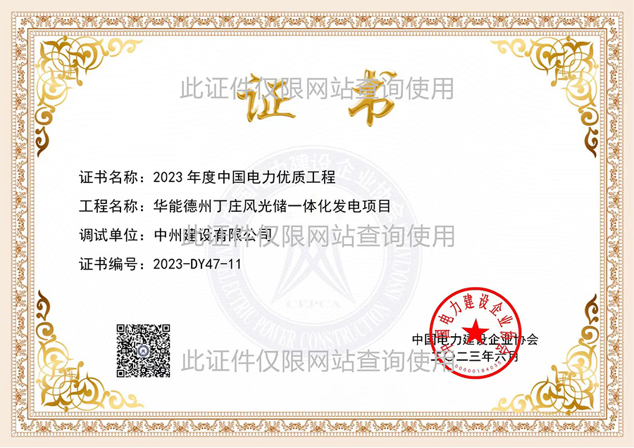 國優(yōu)證書:華能德州丁莊水庫200MW光伏發(fā)電項(xiàng)目主體施工單位